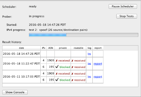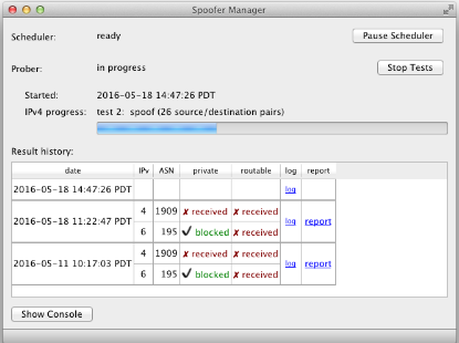 Agora, com os testes já agendados, o Spoofer deve funcionar normalmente. Ele fará os testes sempre que chegue a hora agendada, a rede seja alterada ou se o usuário forçar o início de um novo teste clicando no botão “Start Tests”.