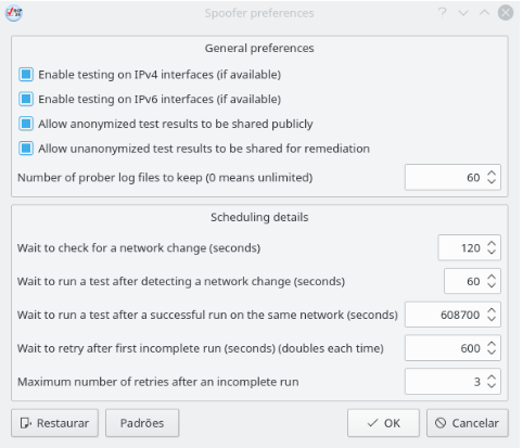 O menu “General Preferences” permite o usuário configurar como o programa funcionará. As primeiras opções se tratam de habilitar/desabilitar o teste de spoofing em pacotes IPv4 e IPv6.