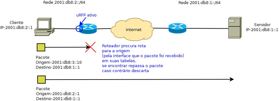 Dessa forma um pacote configurado com endereço incorreto seria descartado pela interface do roteador uma vez que a rota para a rede do endereço de origem não “apontaria” para essa mesma interface.