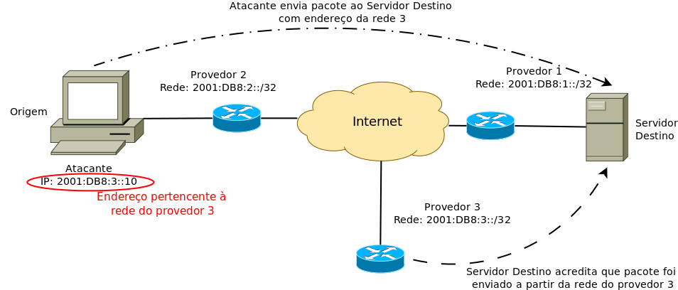 Muitas vezes, pacotes IP com endereços de origem incorretos são enviados para Internet utilizando endereços reservados ou endereços de redes de terceiros. Essa técnica é conhecida como spoofing, ou falsificação de pacotes. Normalmente ela é utilizada em ataques na Internet chamados de negação de serviços(DoS - Denial of Service). Se os equipamentos na rede onde os pacotes foram gerados não verificarem a origem dos pacotes, qualquer ação posterior para identificá-los ou bloqueá-los é muito dificultada. A figura abaixo exemplifica esse tipo de ataque: